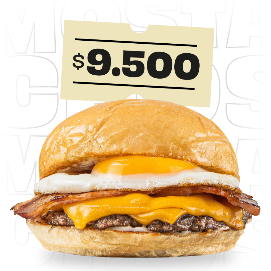 Pan tyuks - Mayo casera - Medallón R.A 120GRS x2 - Cheddar x4 - Panceta dorada - Huevo a la plancha + Papas McCain!
