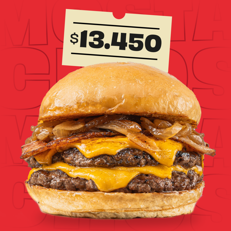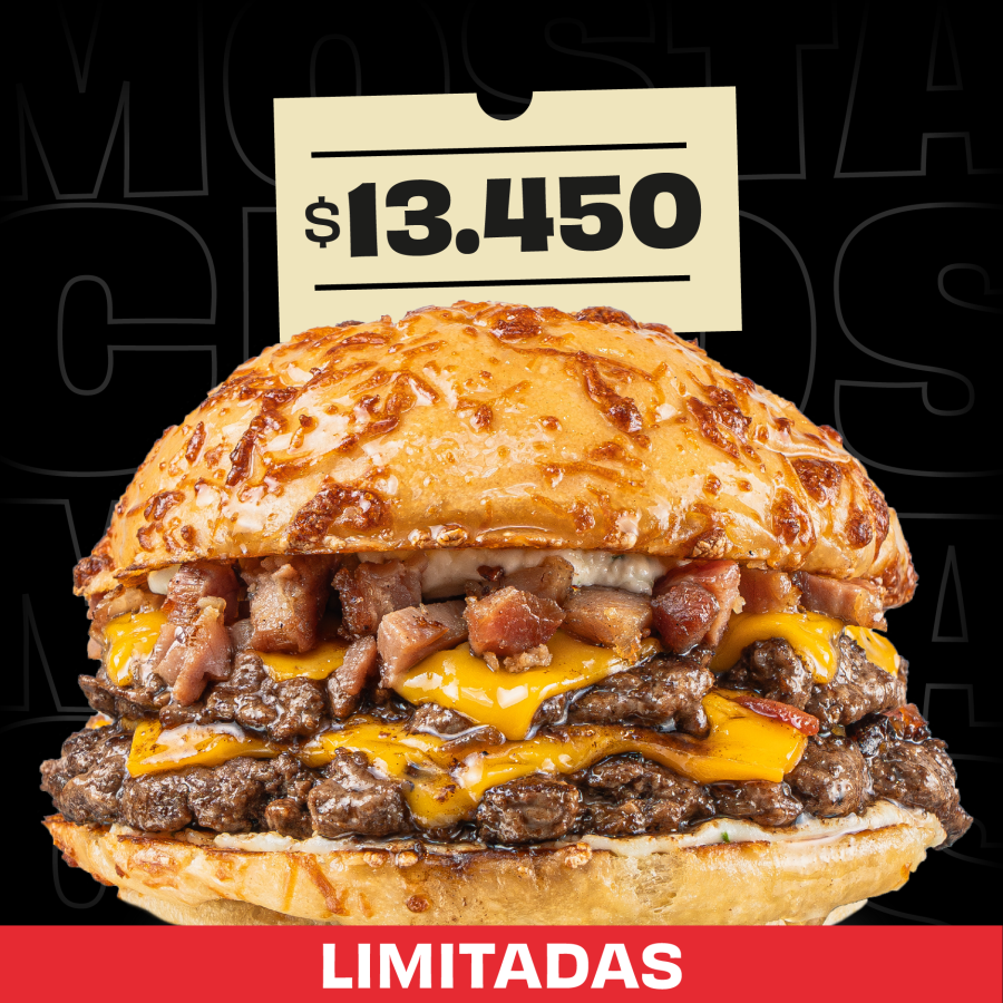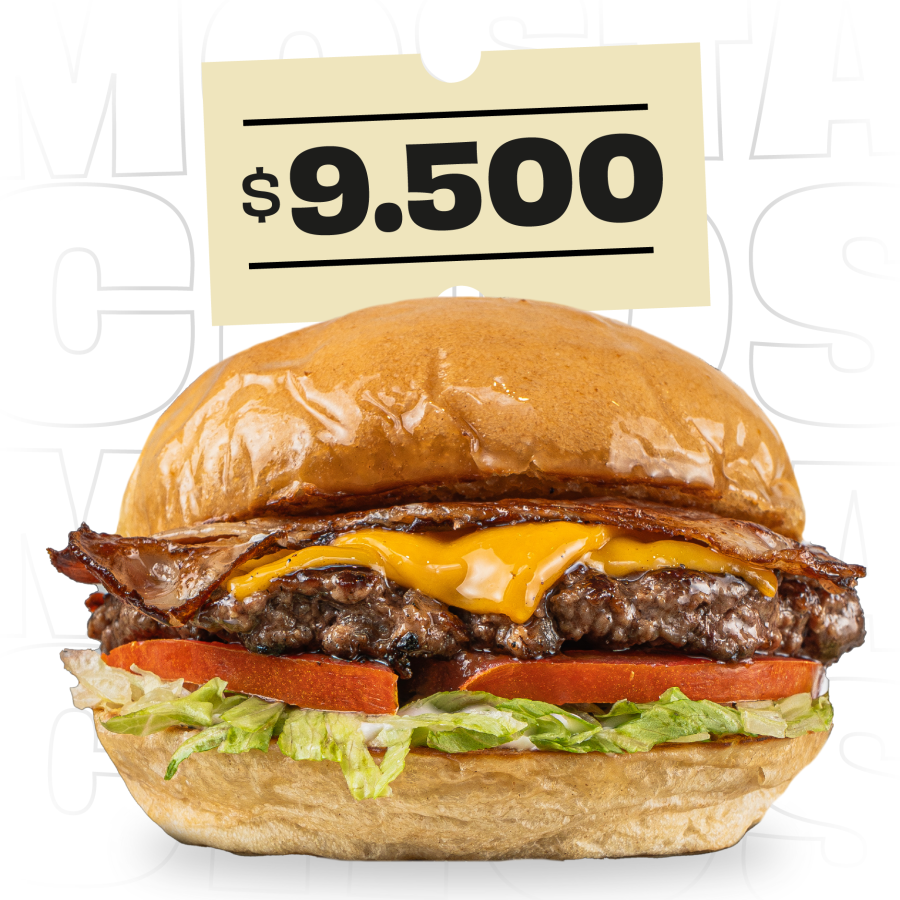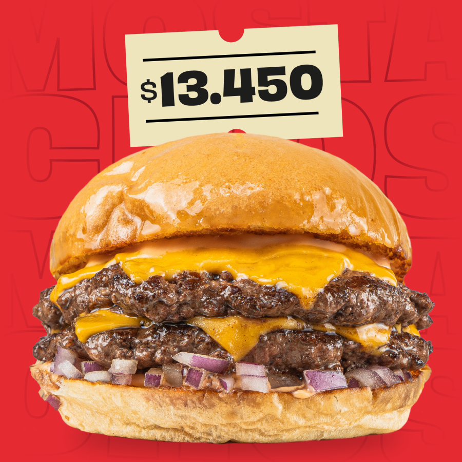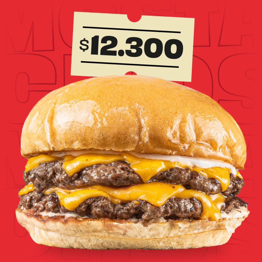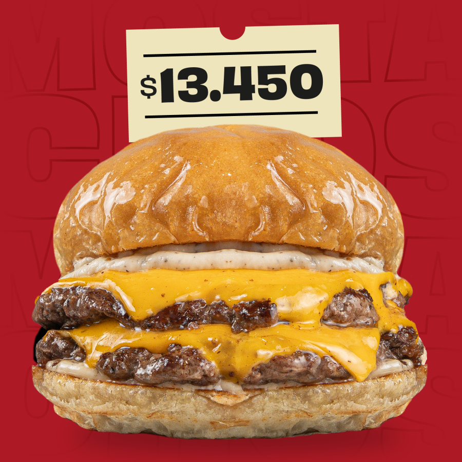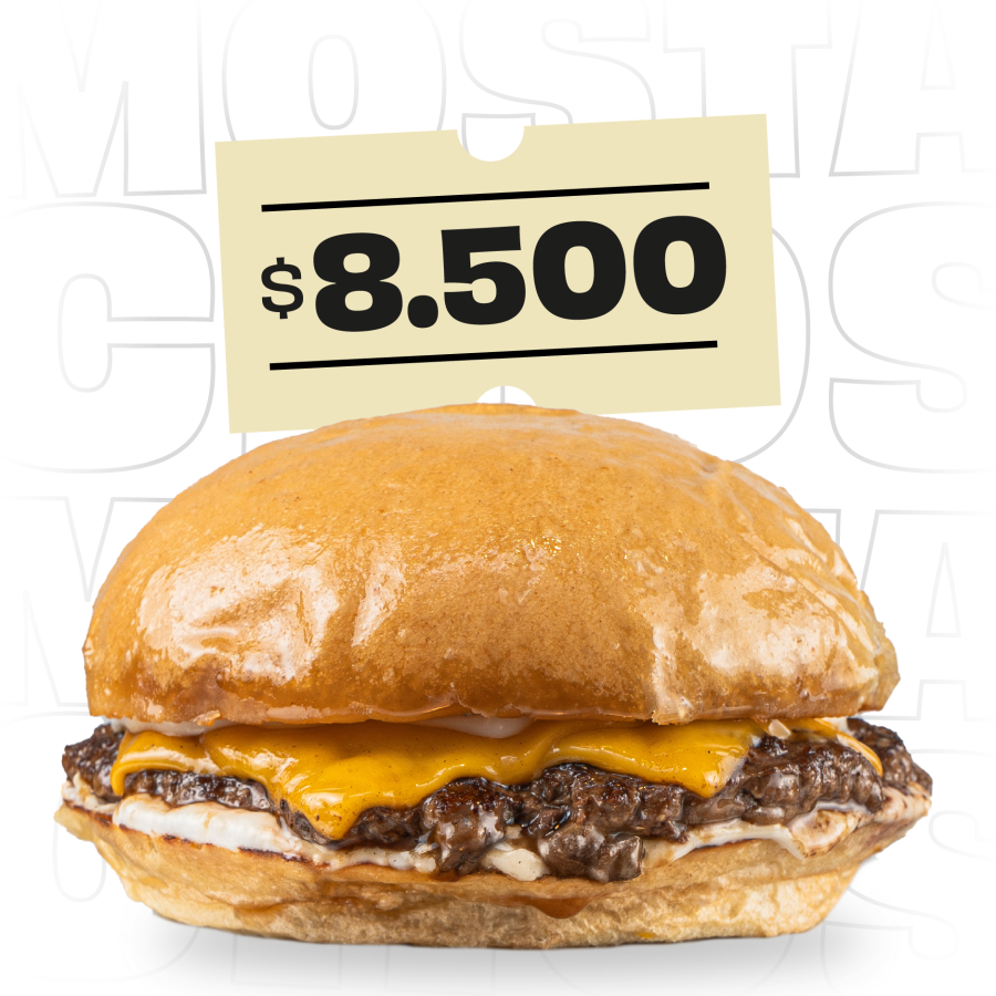 Pan tyuks de queso, Salsita mostachos, x3 Medallón de 90gs smasheado, Cheddar x6, Papas McCain!