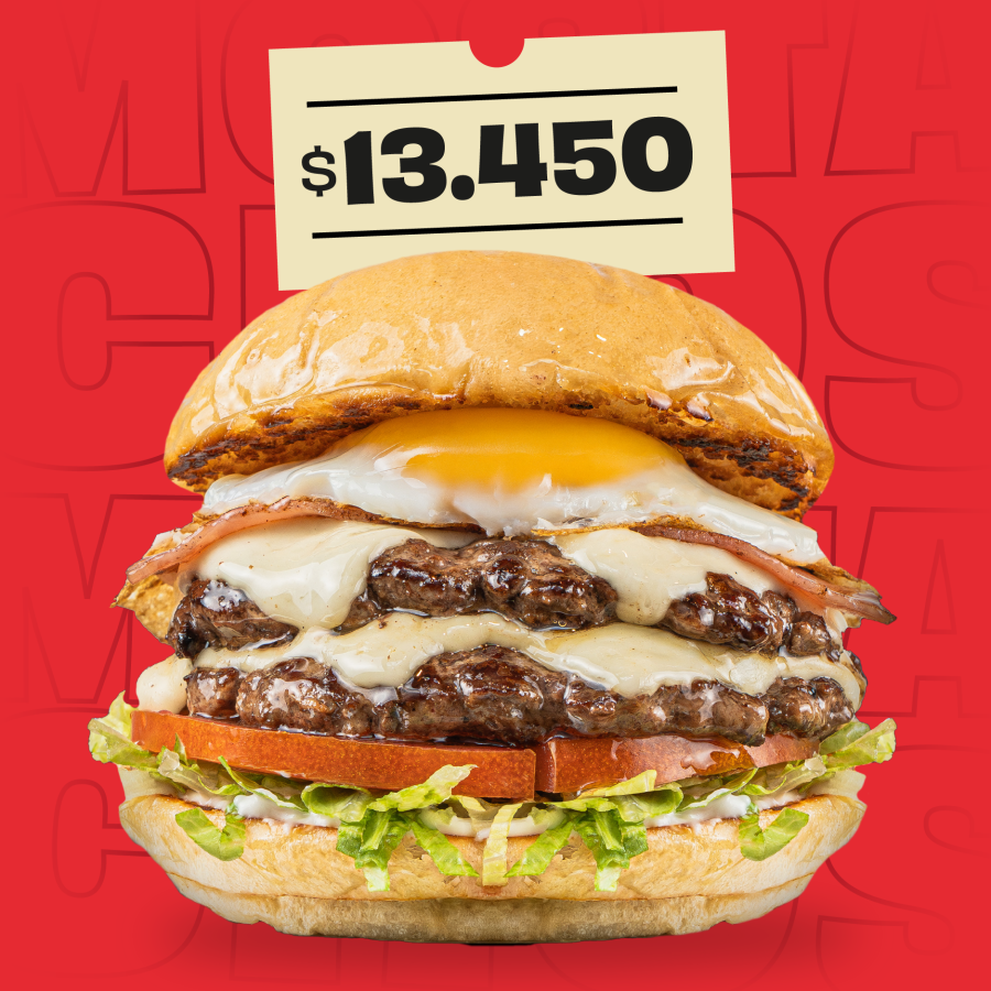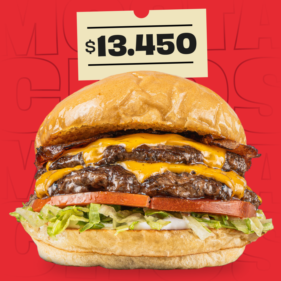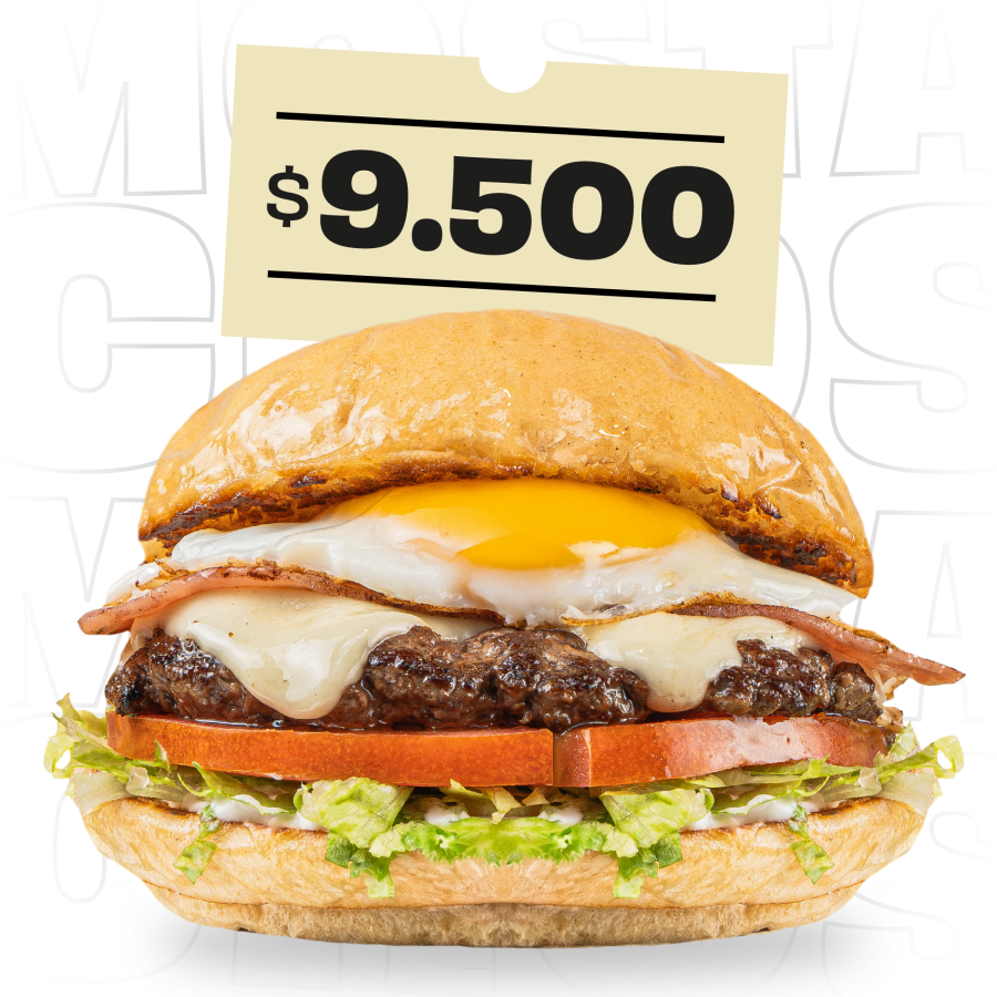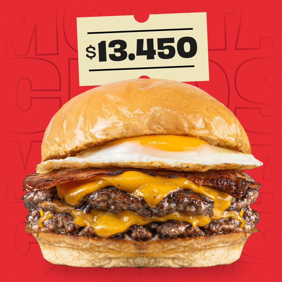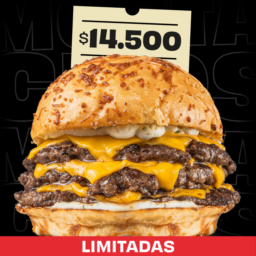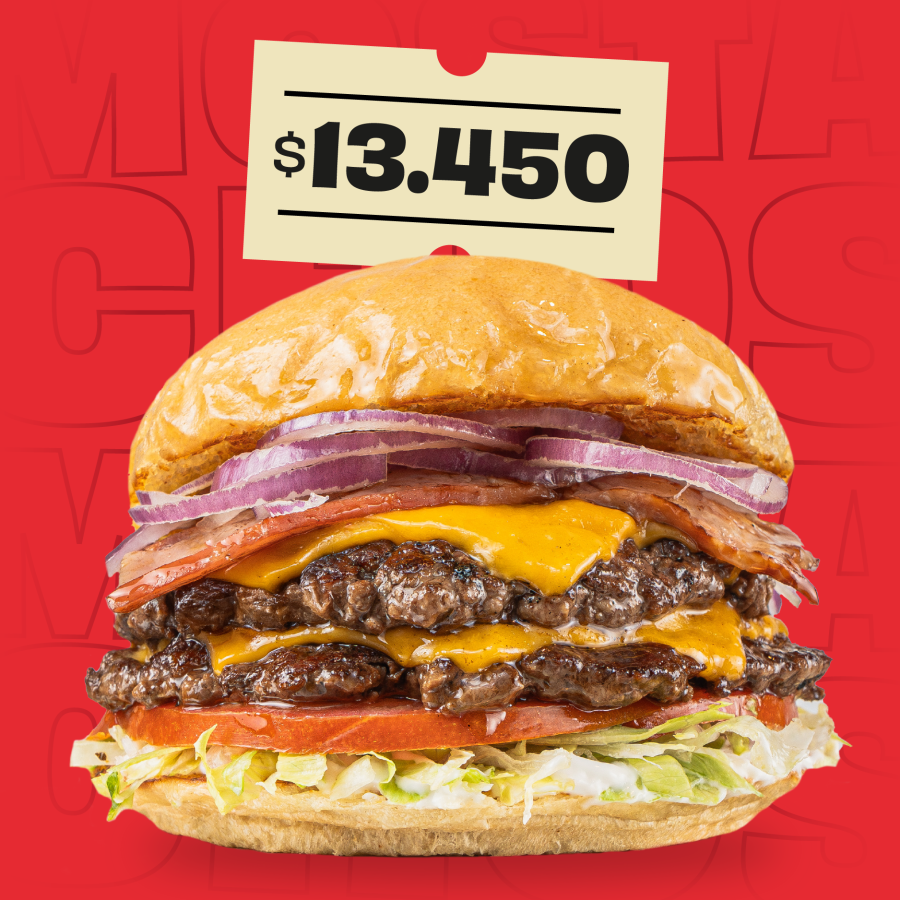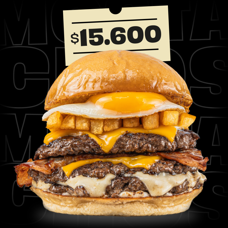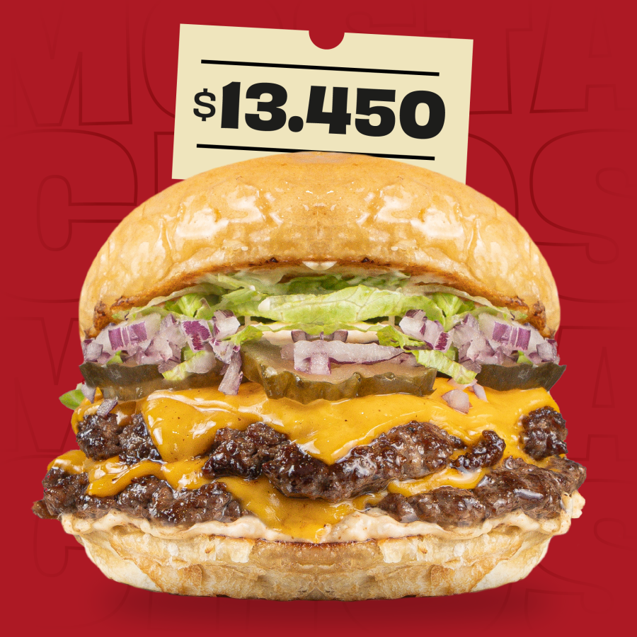 Pan tyuks de queso, Salsita mostachos, x3 Medallón de 90gs smasheado, Cheddar x6, Papas McCain!